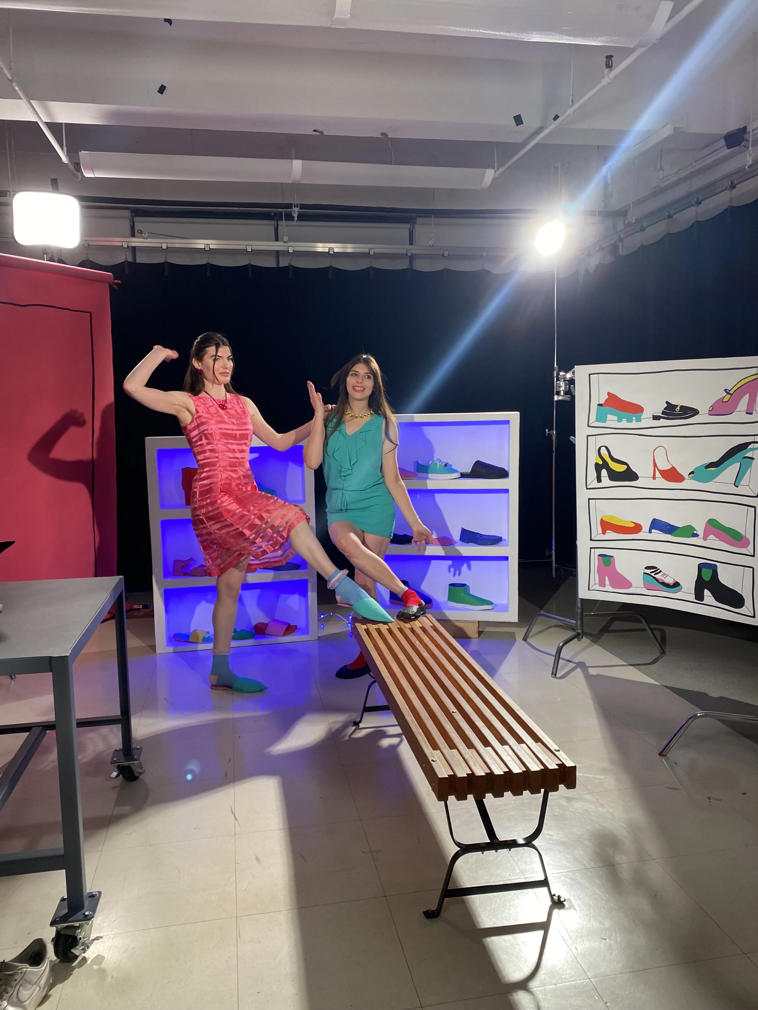 I created the sets and props for my 2025 film Discount Sestina, which is set in a shoe store. With the help of my small crew, I built the artificial shoe store in a photo studio at School of Visual Arts in New York in April 2024, and used C-stands to hang flats representing store decor.