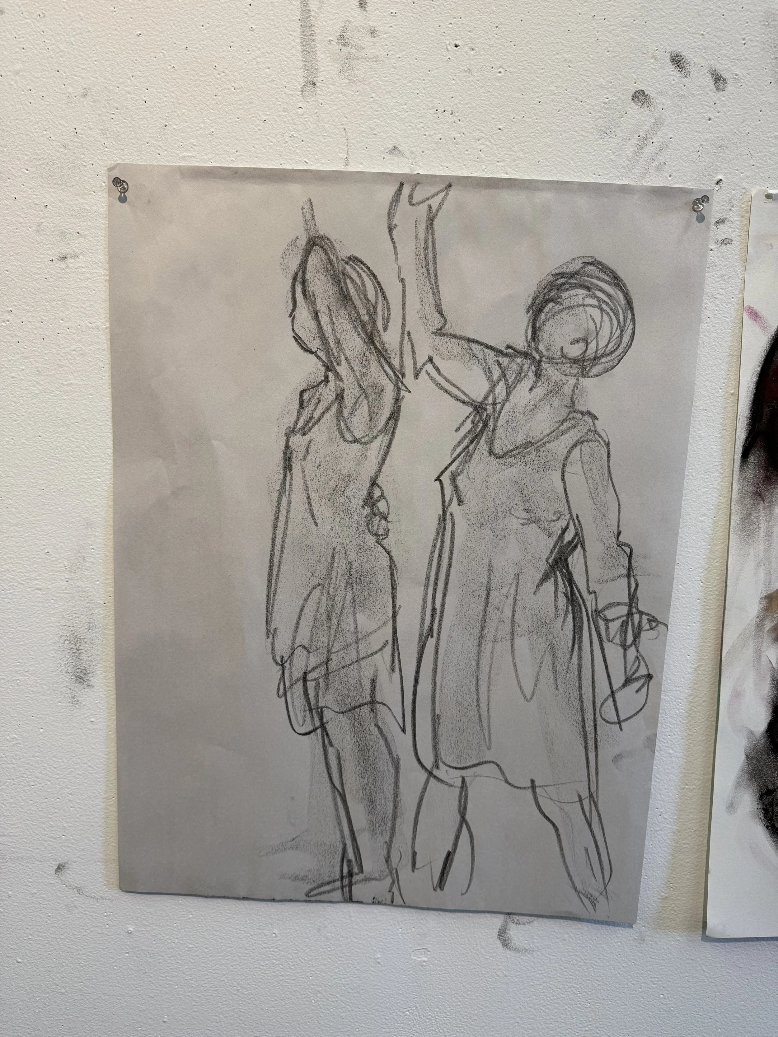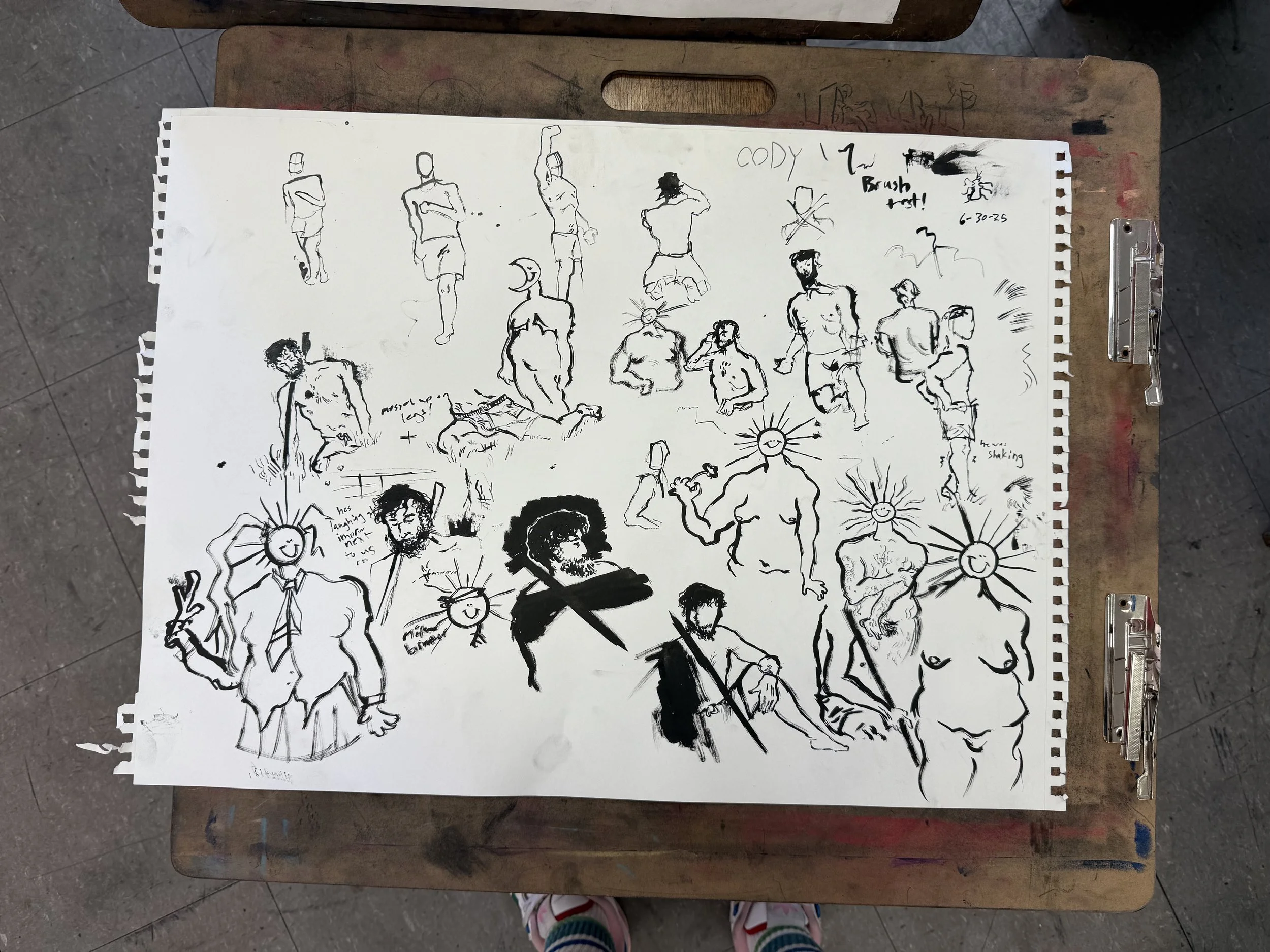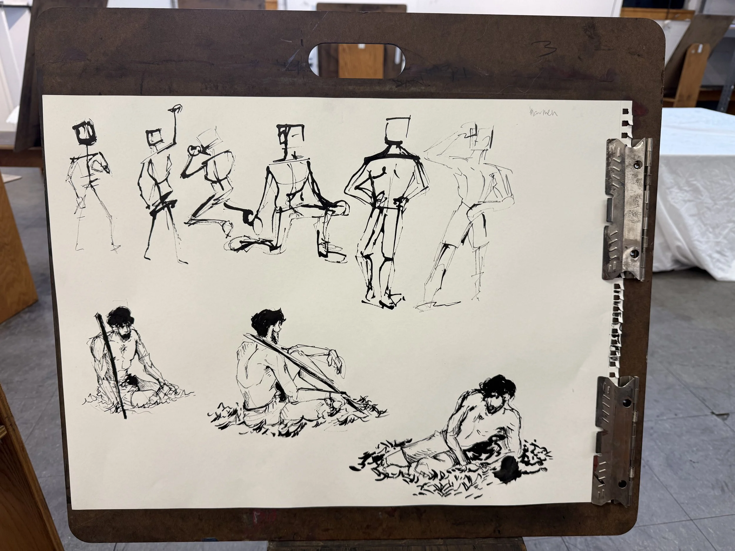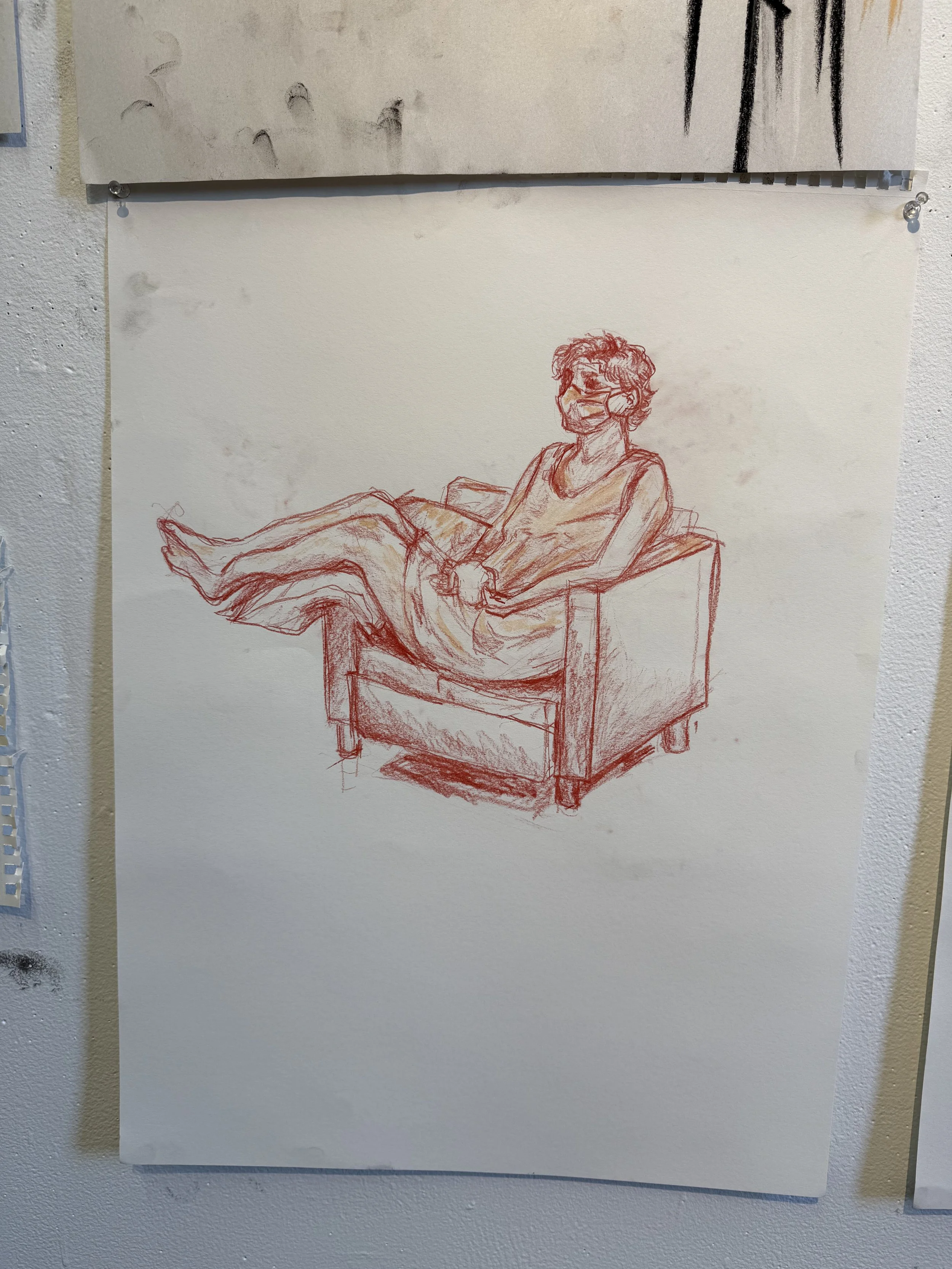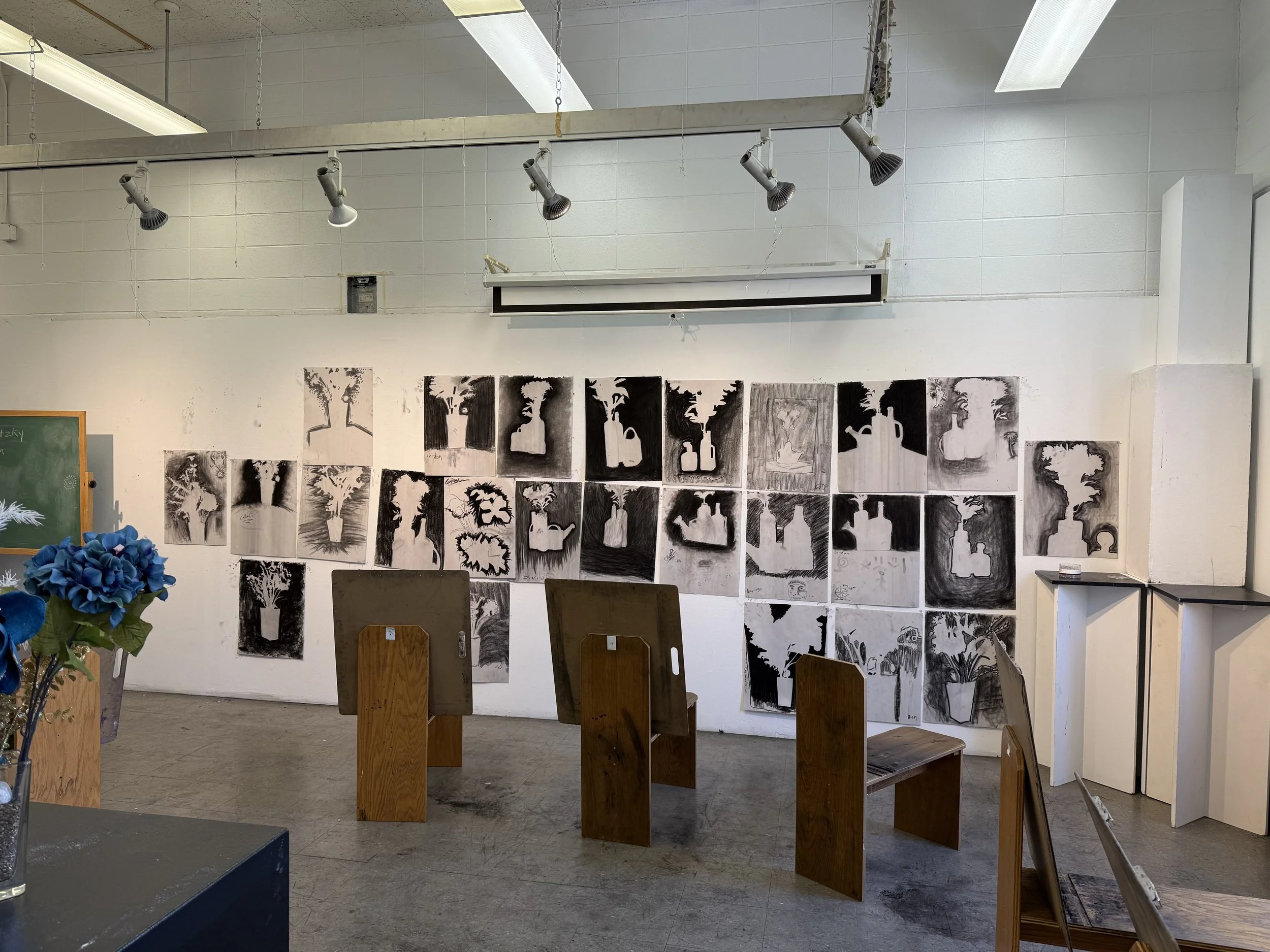 In the summer of 2025, I taught two sections of a two-week Observational Drawing class for high school students ages 14-18. Students started out rendering the negative space around an object, created gesture drawings between 30 seconds and 2 minutes, built up their skills by learning “sighting” and other proportion techniques, and finally ended the class with a few longer drawings with seated poses. Students used a range of materials including charcoal (vine and compressed), graphite sticks, 2B and 4B pencils, conte crayons, and sumi ink applied using wooden skewer sticks. Some students chose to explore chalk pastel on the last 2 days, during which I let students choose their materials.